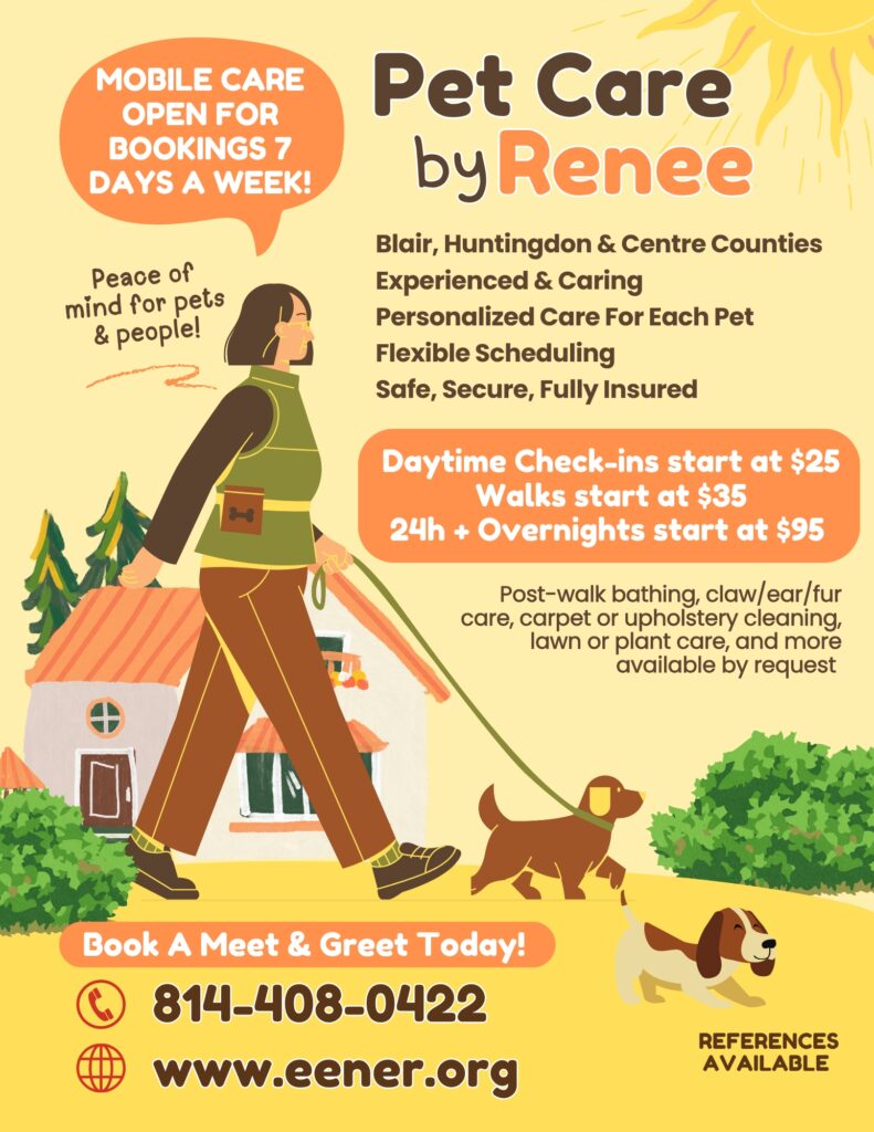 WELCOME to Pet Care by Renée Bringing peace of mind to pets and people through personalized care and services that fit you and your animal companions’ needs and preferences Schedule a Visit Request a New Client Meet & Greet or Fill Out the Service Request Form!